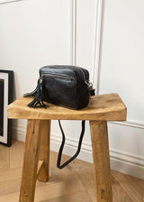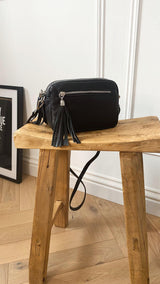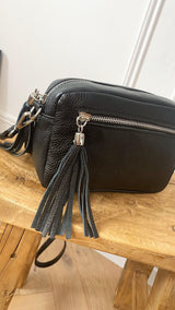 Real leather cross body bag with double tassel, front zip and removable shoulder strap....