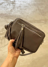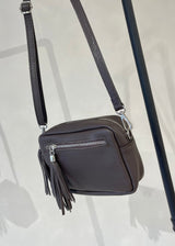 Real leather cross body bag with double tassel, front zip and removable shoulder strap....