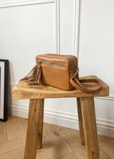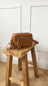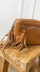 Real leather cross body bag with double tassel, front zip and removable shoulder strap....