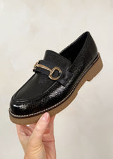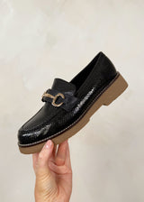 Elevate your wardrobe with the Kimmy Snaffle Loafer in black. Featuring a chunky 1.5-inch wedge and stylish snake skin effect, this loafer blends modern edge with timeless appeal. The gold effect hardware adds a touch of sophistication, making it a versatile essential that pairs effortlessly with both casual and formal looks. Perfect for those seeking comfort without compromising style this season.