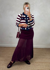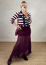 Elevate your wardrobe with the Patsy pleated skirt in Merlot, designed in Paris and crafted with love. Its versatile pleated design effortlessly transitions from casual to chic, pair with wedges or heels for a polished look, or dress down with pumps or boots for everyday elegance. A must have piece that adds timeless style and comfort to your collection.
