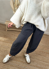 Easy to wear jersey jogger pant with stretch waist, wide leg and tapered cuff...