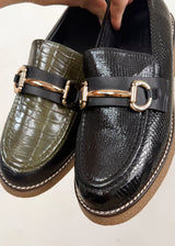 Elevate your wardrobe with the Kimmy Snaffle Loafer in olive and black. Featuring a chunky 1.5-inch wedge and stylish snake skin effect, this loafer blends modern edge with timeless appeal...