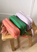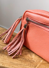 Real leather cross body bag with double tassel, front zip and removable shoulder strap....