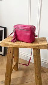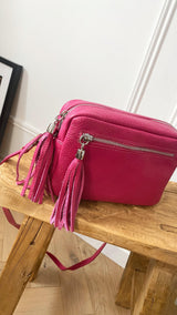 Real leather cross body bag with double tassel, front zip and removable shoulder strap....Perfect SS22 accessory…