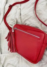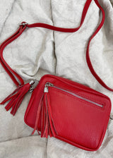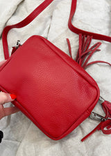 Real leather cross body bag with double tassel, front zip and removable shoulder strap....