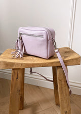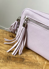 Real leather cross body bag with double tassel, front zip and removable shoulder strap....