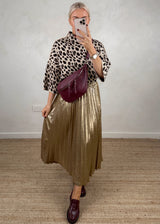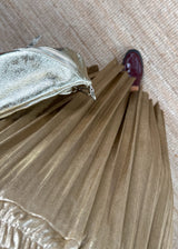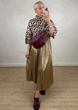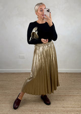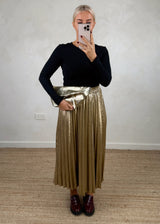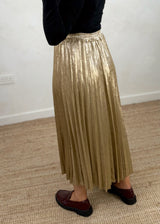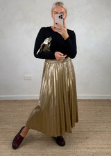 Elevate your wardrobe with the Fern pleated skirt in shimmering gold. Crafted in Italy...