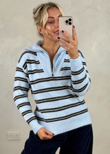Elevate your seasonal style with the Jodie striped half zip knit in sky blue a versatile piece that effortlessly transitions from casual to dressed up occasions.