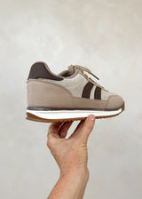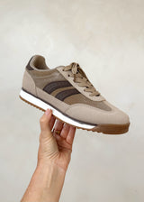 Elevate your everyday style with the Axel Trainer in latte. Featuring a sleek suede effect finish and classic lace closure design, this trainer combines comfort with timeless appeal. The subtle stripes add a sporty edge, making it an essential piece that effortlessly complements any wardrobe. Perfect for those who value both fashion and function.