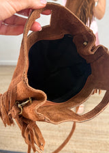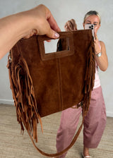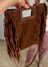 Elevate your everyday style with this stunning fringed suede bag in rich tan...