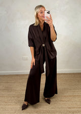 Elevate your wardrobe with the Jenson tie front blazer in classic chocolate, crafted in Italy for superior quality. Featuring elegant gold effect hardware, this essential piece combines sophistication with a super soft feel for all day comfort. Perfect for adding a polished touch to any outfit.
