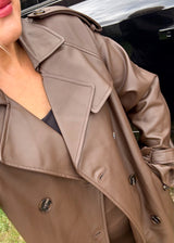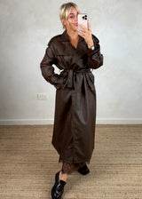 This Midnight trench coat in chocolate is an essential wardrobe piece designed for versatility and style.