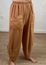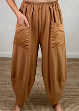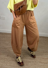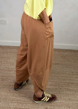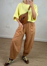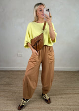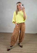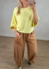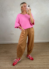 Easy to wear jersey jogger pant with stretch waist, wide leg and tapered cuff.