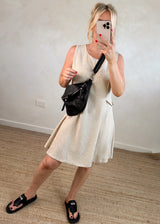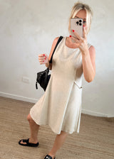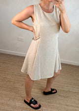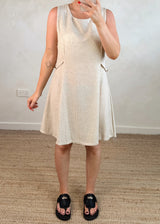 This beige pinstripe shift dress is a must have for your summer wardrobe. Its flattering midi length makes it versatile, dress it up with wedges for a chic evening look or keep it casual with sandals or pumps. Perfect for holidays, brunches, or nights out, this essential piece combines comfort and style effortlessly.