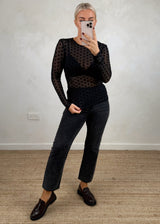 Elevate your wardrobe with this sheer frill long sleeve top in classic polka black. Perfect for the seasons ahead, it adds a delicate touch whether layered or worn on its own. Its lightweight, see through fabric and elegant frill details make it an essential piece for dressing up any outfit, seamlessly blending sophistication with versatility.