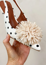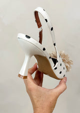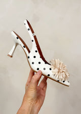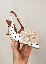 Step confidently with the Salma heel in polka dot. Featuring an elegant corsage flower and an elasticated heel for a perfect fit, this 3.5 inch heel offers both style and comfort. An essential addition to your wardrobe this season, it effortlessly elevates any outfit from day to night.