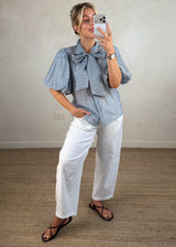 Striped pussy bow blouse - Powder blue/chocolate