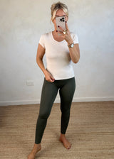 These khaki sculpt leggings are an essential piece for your wardrobe, designed with stretchy fabric to provide comfort and flexibility. Perfect for the season ahead, they effortlessly blend style and functionality, making them ideal for both casual outings and active days. Upgrade your everyday look with leggings that move with you.