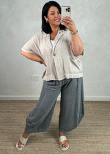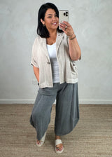 Crafted in Italy from a breathable 50% linen and 50% cotton blend, the Lucia shirt in slate is the versatile essential every wardrobe needs. Layer it effortlessly with pieces from the Amalfi range for coordinated looks that transition seamlessly from casual brunches to holiday getaways. Its natural fabric composition keeps you comfortable across all seasons, making it the perfect go to for any occasion.