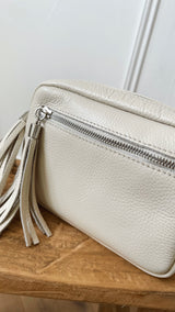 Real leather cross body bag with double tassel, front zip and removable shoulder strap....Perfect SS22 accessory…